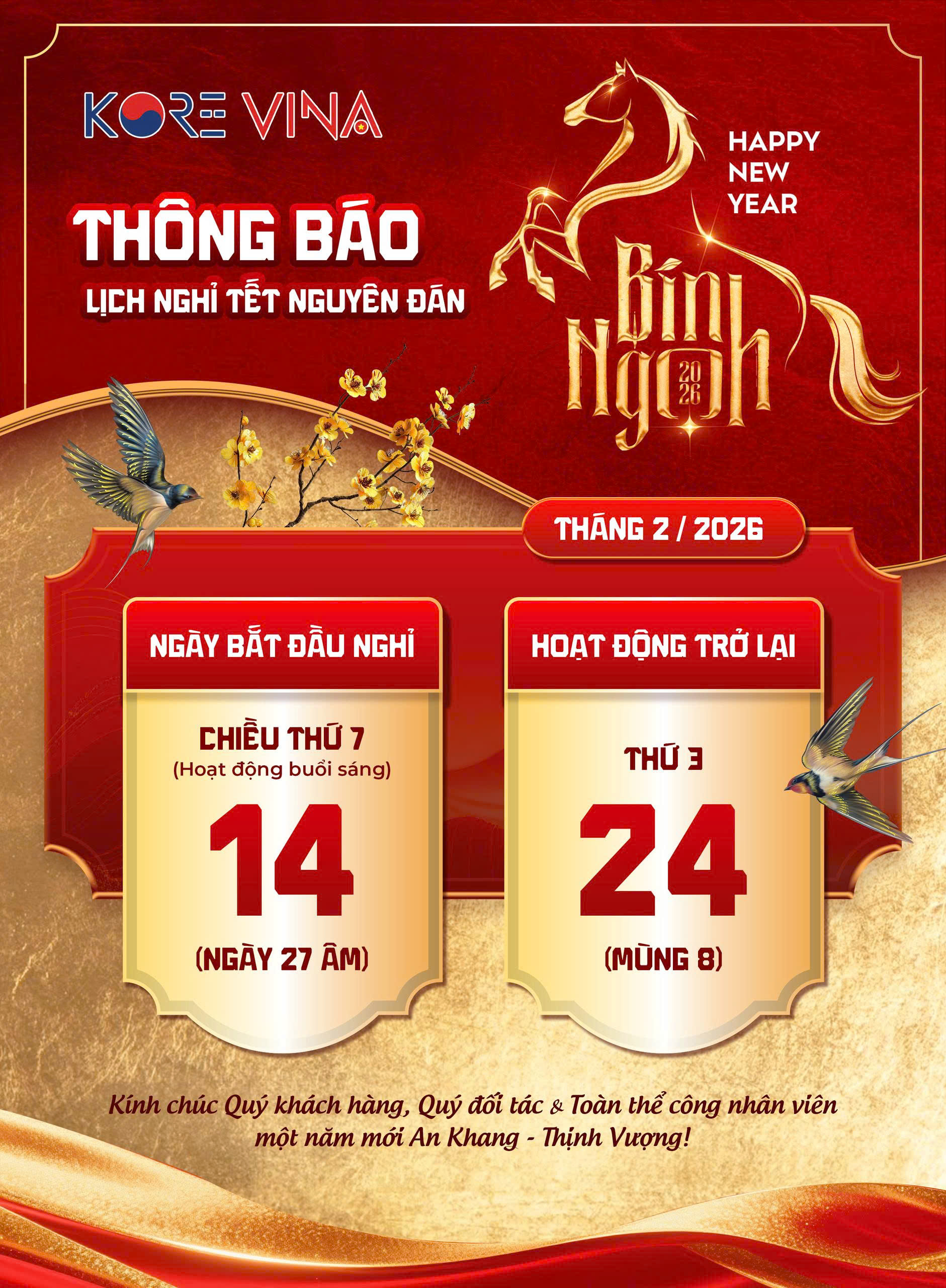 THÔNG BÁO LỊCH NGHỈ TẾT NGUYÊN ĐÁN BÍNH NGỌ 2026