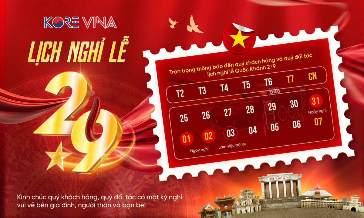 Nhân dịp Quốc Khánh 2/9, Công ty TNHH Korevina xin trân trọng thông báo đến Quý khách hàng và Quý đối tác lịch nghỉ lễ như sau: